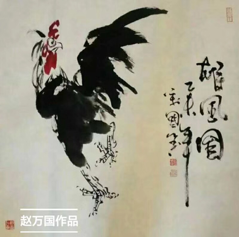 赵万国,号点睛楼,国家一级画师,幼得祖父齐白石弟子赵华岩先生真传,曾多次得到国画大师陈大羽先生指点,在大写意花鸟画的创作中独树一帜。现任中国美术家协会山东分会会员,齐鲁画院特聘画家,赵万国自幼受祖父齐白石弟子赵华岩影响,受教于著名画家和美术教育家王伯敏、卢坤峰、吴山明、周昌谷、吴静初、刘国辉诸名家。在浙期间受上辈艺术大师潘天寿、林风眠、诸乐三等人遗泽滋养,奠定了其坚实的艺术功力,深得浙派画风神韵,进而在实践中逐步形成了鲜明的个人风格。近些年更在创作空隙中交流借鉴,转益多师,拜访请教前辈画家和同行,开阔了眼界,提高了画艺。赵万国先生多年来潜心钻研,成绩斐然,在人物、花鸟、山水诸领域多有建树,其画作常发表于报刊杂志。近些年来,他沉心于国画鸡的创作之中,每每执笔沉思至东方欲晓,欣然落笔,寥寥数笔傲然形象跃然纸上,雅俗共赏的立意、夸张灵动的形象、流利干净的线条、别出心裁的构图受到同行称赞和群众喜爱。