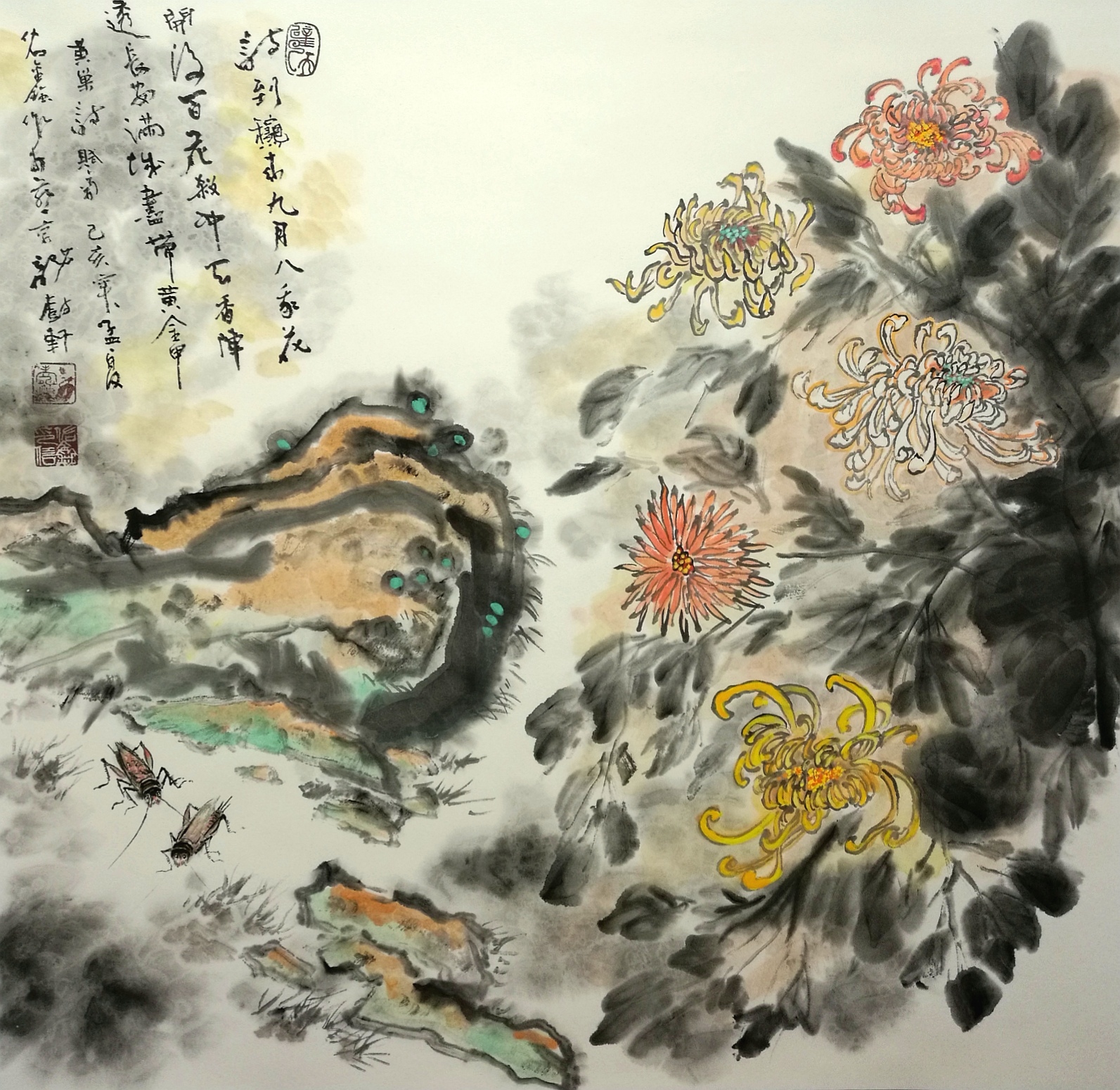 (以配合诗情画意,画面主色调以黄为主,一对蟋蟀以诗词暗喻主题,历史上有名农民起义“黄巾起义”,黄巢是诗人,又是黄巾军的领袖,他以菊喻志,借物抒怀,通过刻划菊花的形象、歌颂菊花的威武精神,表现了作者等待时机改天换地的英雄气魄。