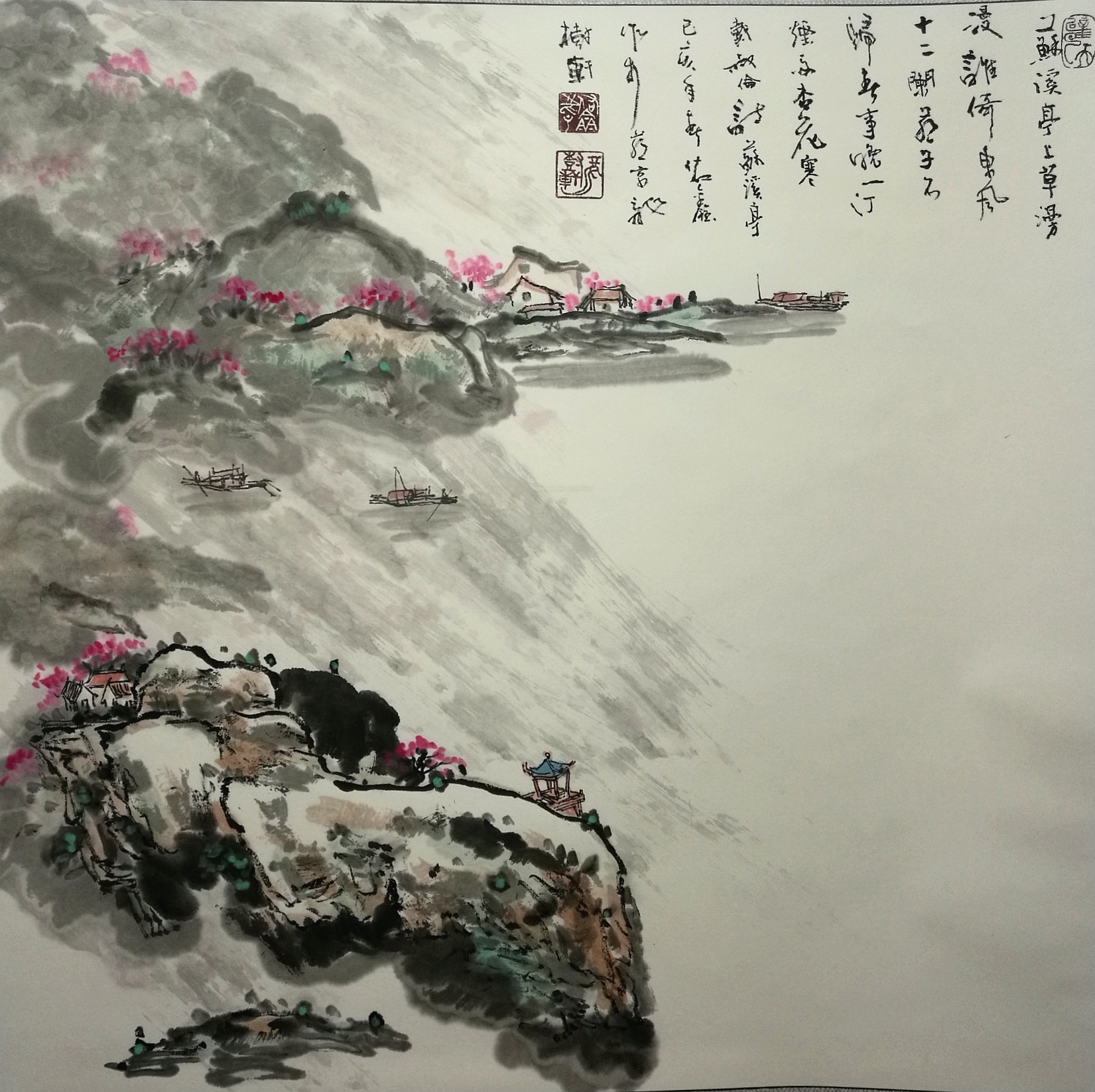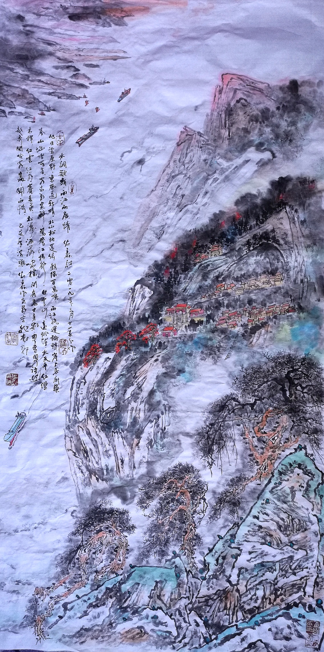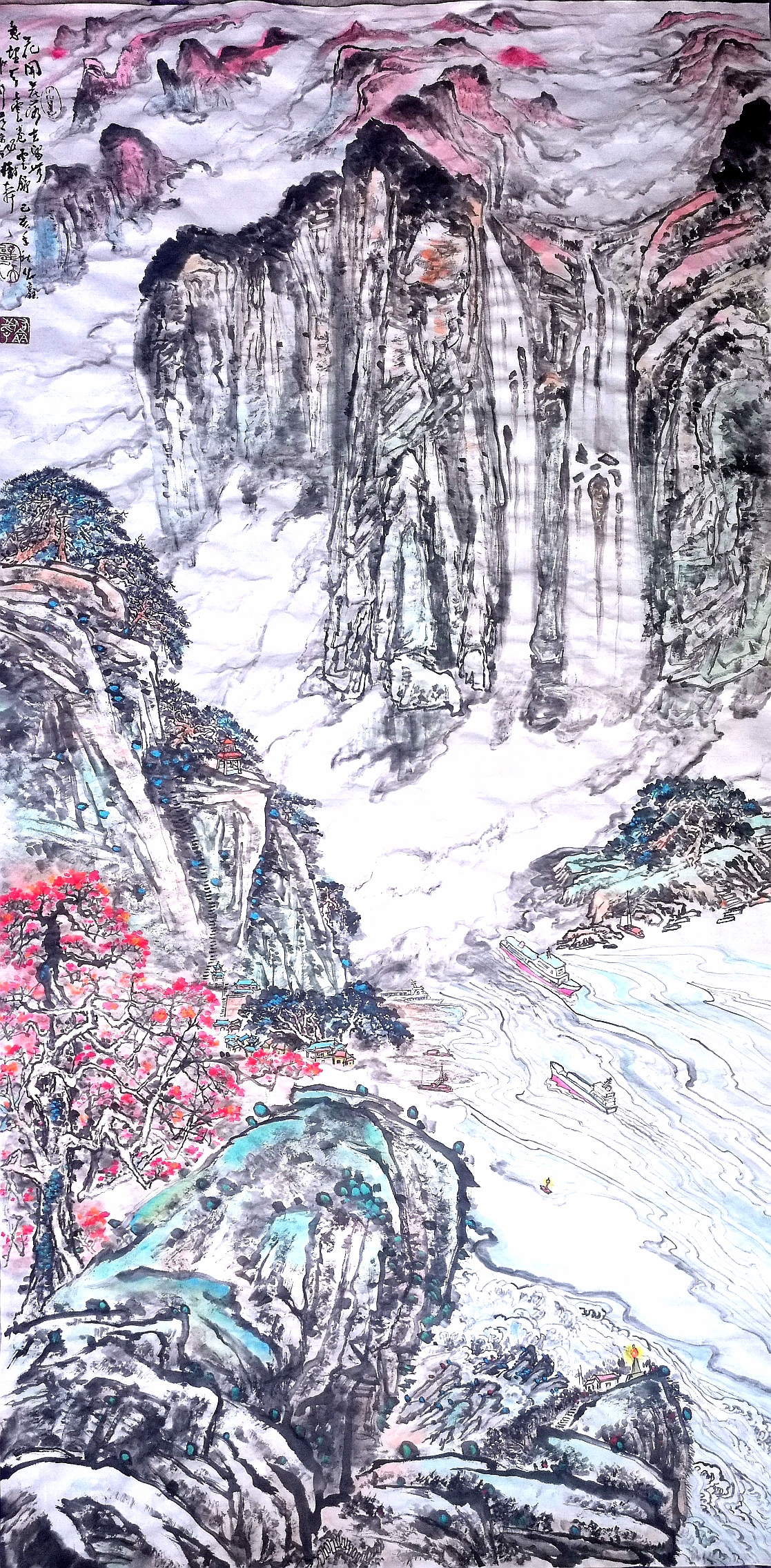 作品名称:西江航运木棉情、作品编号——山水013——2、规格:136cm ×68cm(4平方尺)作品材质:纸本,作品未装裱