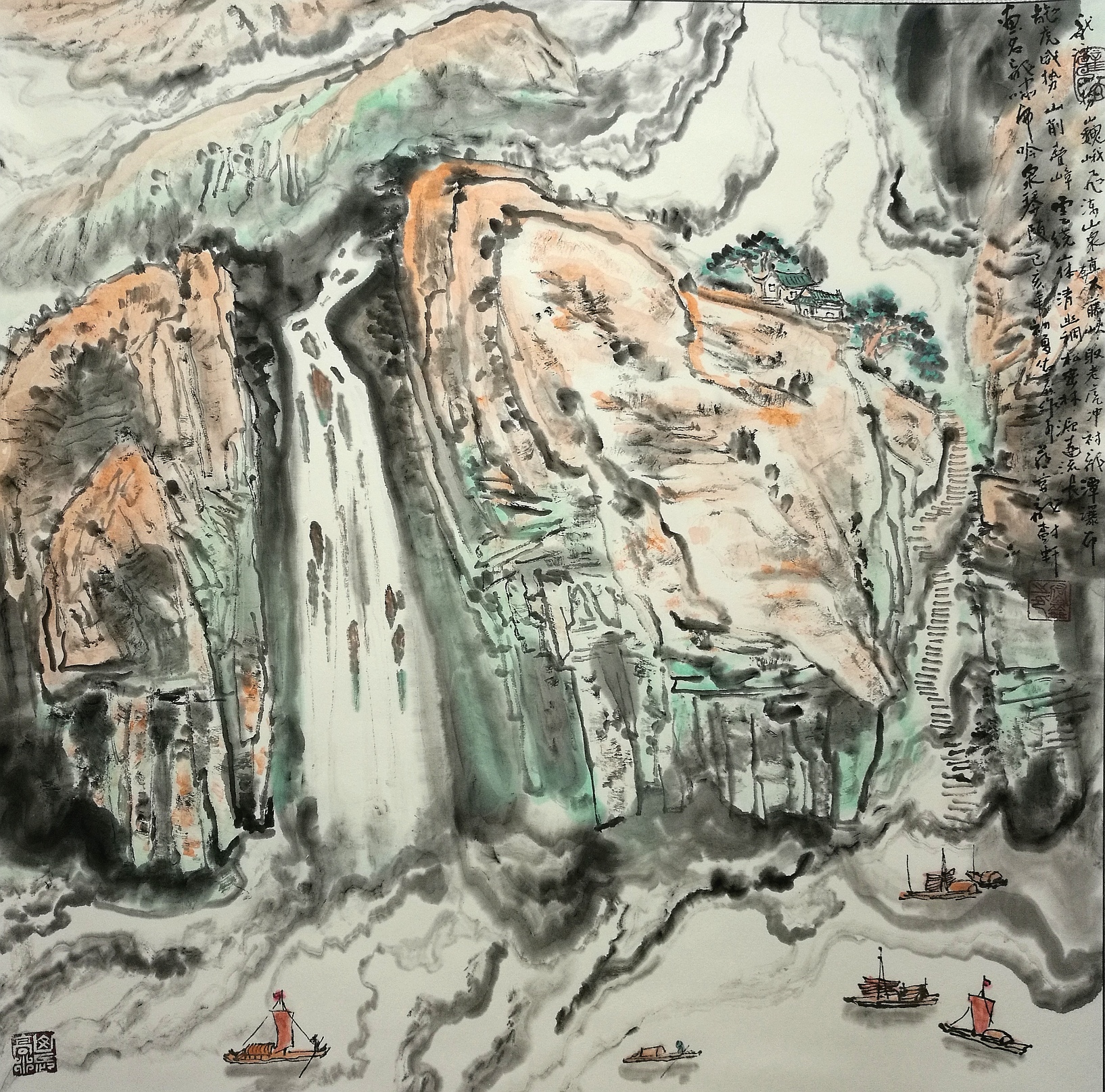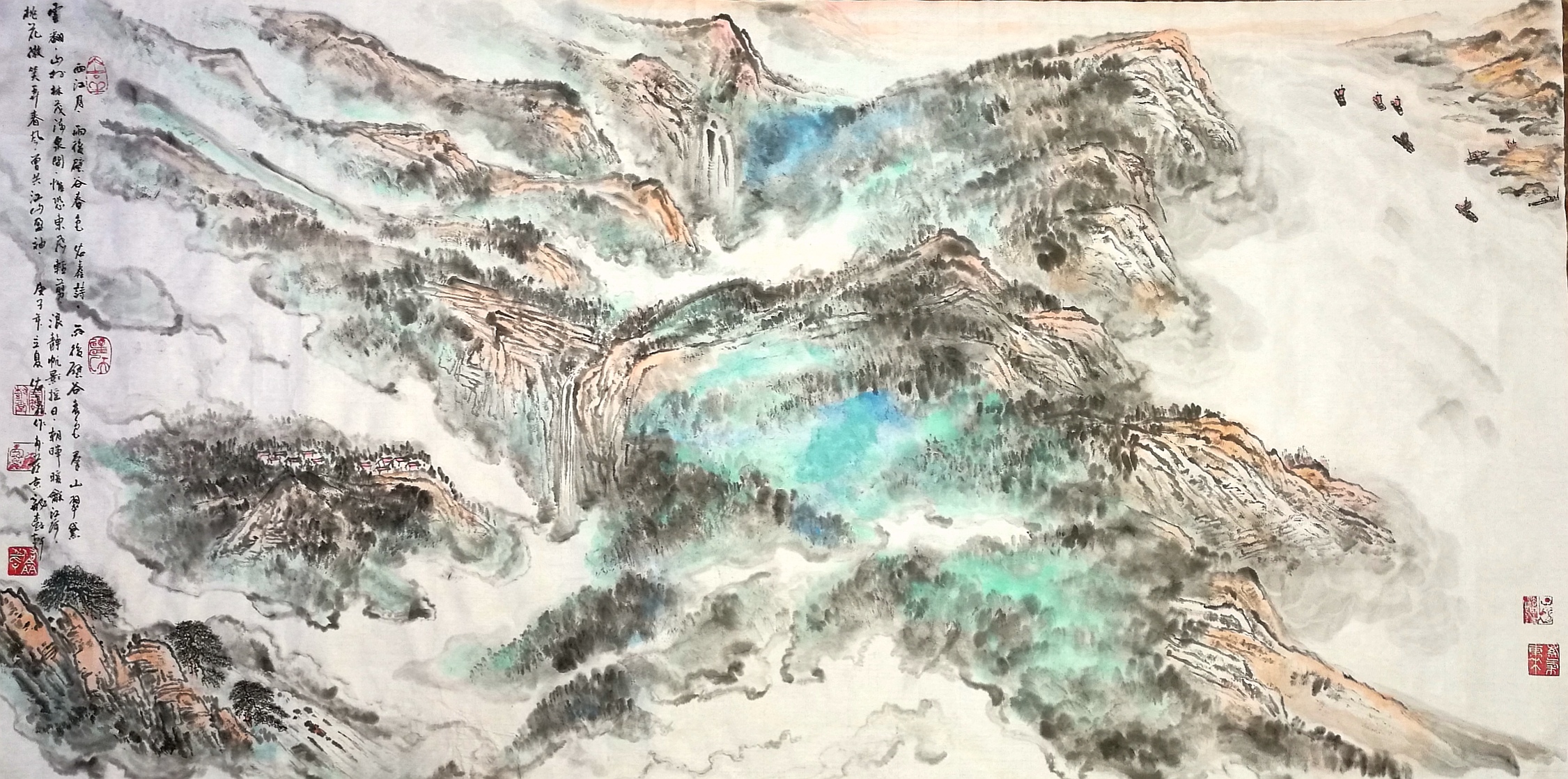 这是岭南画派西江峡谷画作,典型的西江流域两岸(山势、瀑布、烟云、古木棉树、古榕树、古松树、古滕滩涂)风光、河道、航站楼、航标灯、航运、木船货运。