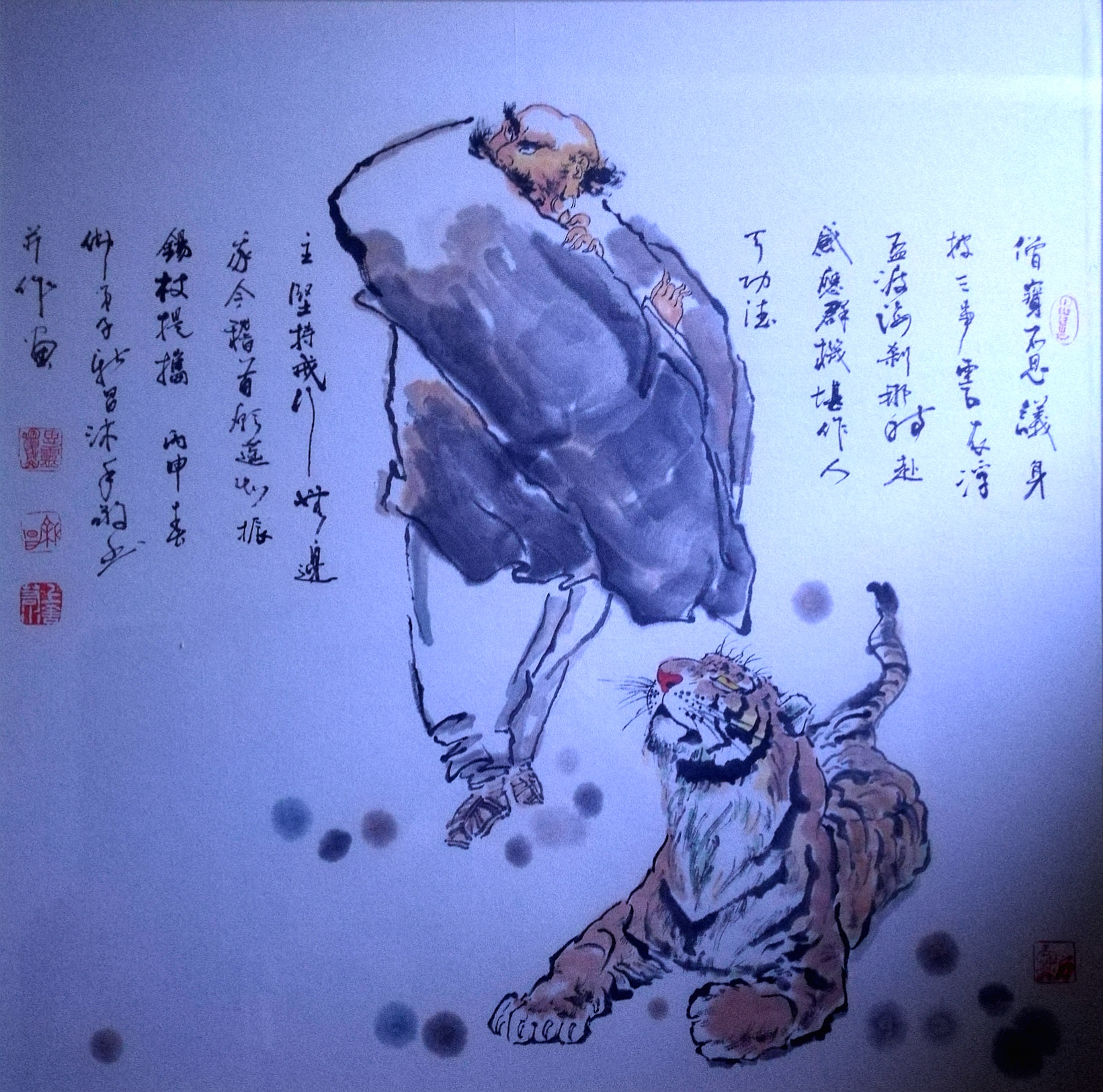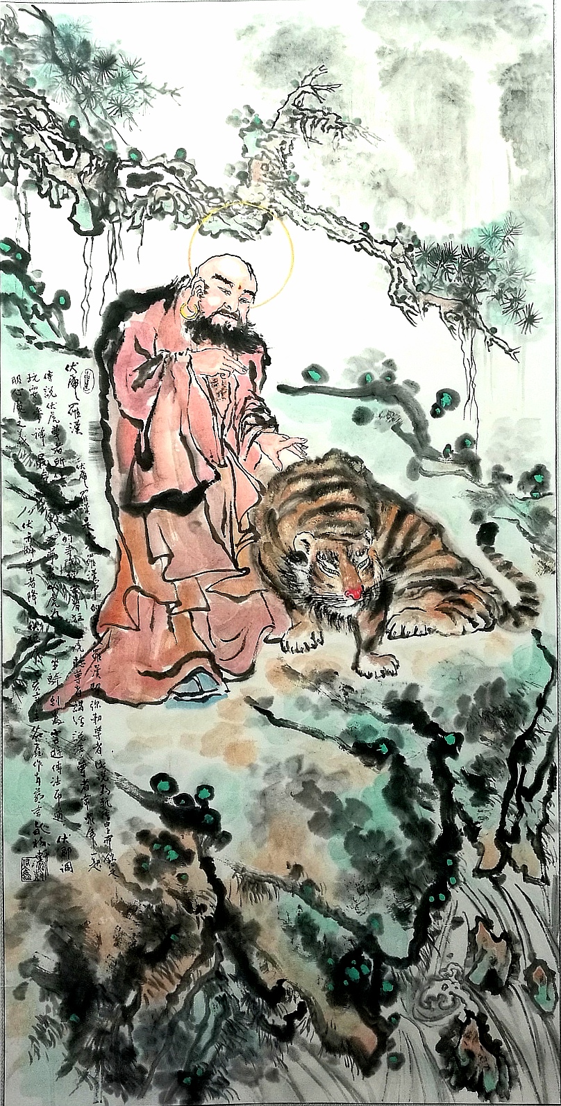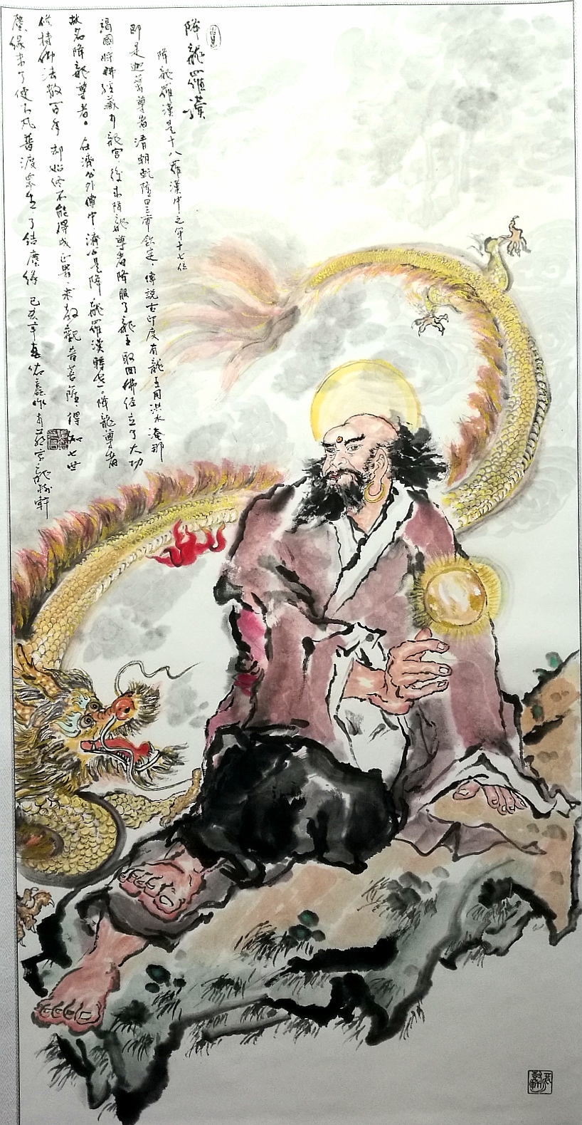 (五爪金龙,见首不见尾,祥云相随。罗汉为长眉罗汉,眉慈须白,衣为天衣,衣随意而生,衣服正法隐藏“嗡嘛呢叭咩吽”梵文,竹报平安吉祥)