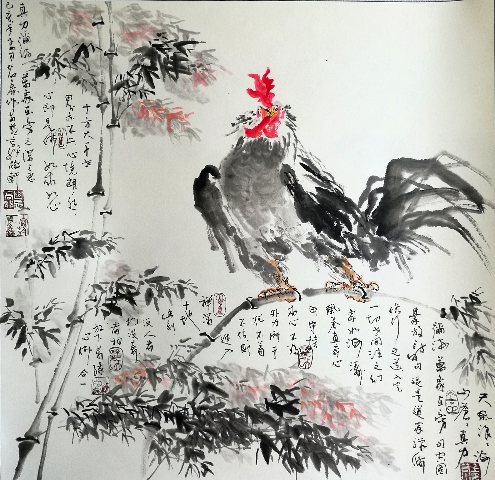 题词:头上红冠不用裁,满身雪白走将来。平生不敢轻言语,一叫千门万户闻。