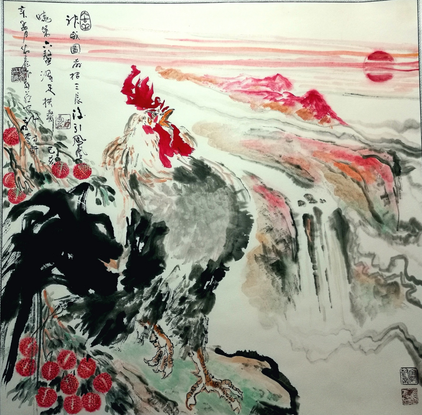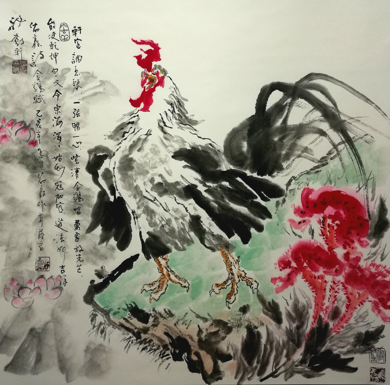 (岭南民俗,冠上加冠,为加官进爵之意,该画采用没骨写意画法,将金鸡之冠加上三个鸡冠花表达诗意。红莲表达妙吉祥之意。)