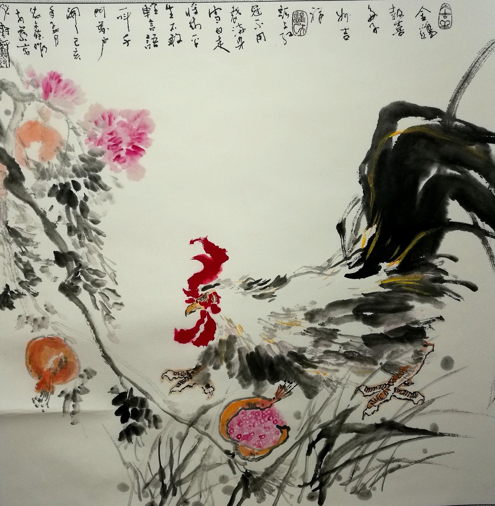 (岭南民俗喜庆题材国画,金鸡为吉祥报喜,山石榴果为多子多福。金鸡报喜国画,平民百姓喜爱。该画采用没骨写意画法。)