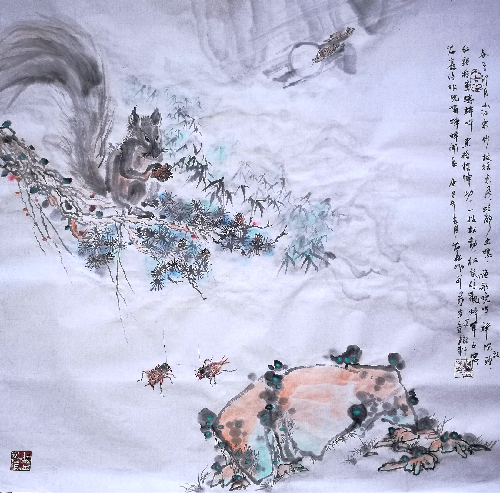 题词:春色印月小江东,竹林摇东风。蛙声虫鸣,渔歌晚唱,禅院鼓钟。红头将军蟋蟀叫,黑将摆阵功。一枝松动松鼠壁观,蟀军占宫。