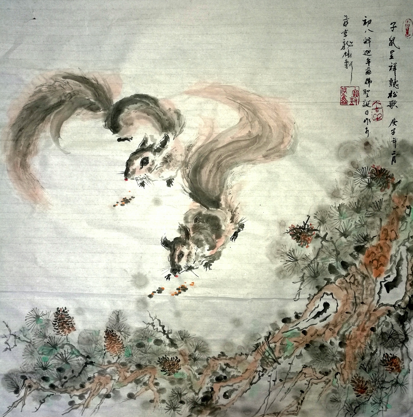 松鼠松针,摇曳洒翠麟。