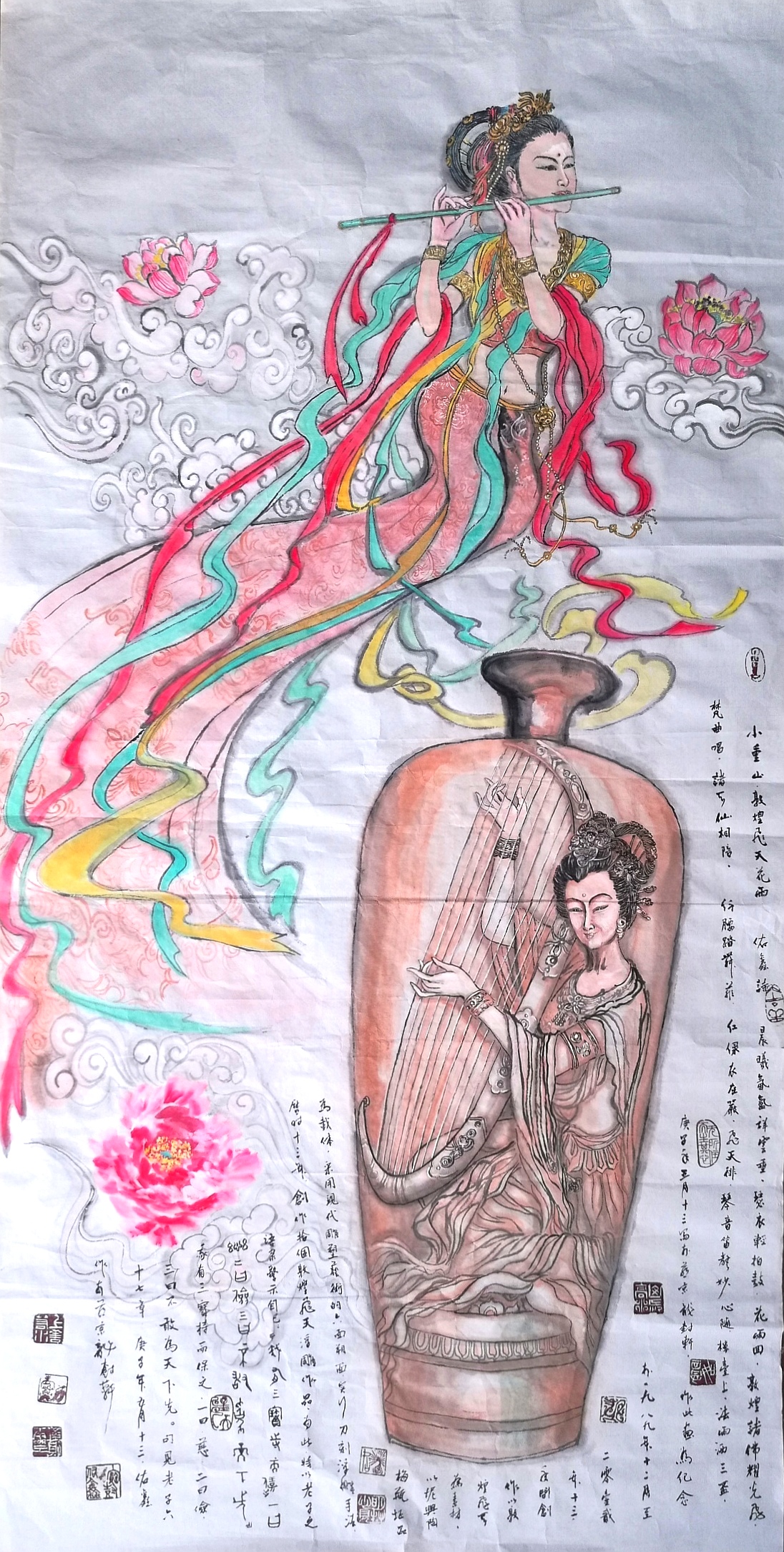 作此画为纪念于一九八九年十二月二零壹贰年(的)十三年间,创作以敦煌飞天为素材,以坭兴陶梅瓶坯品为载体,采用现代雕塑艺术的六面塑面,实行刀刻浮雕手法,历时十三年,创作拾个敦煌飞天浮雕作品。
