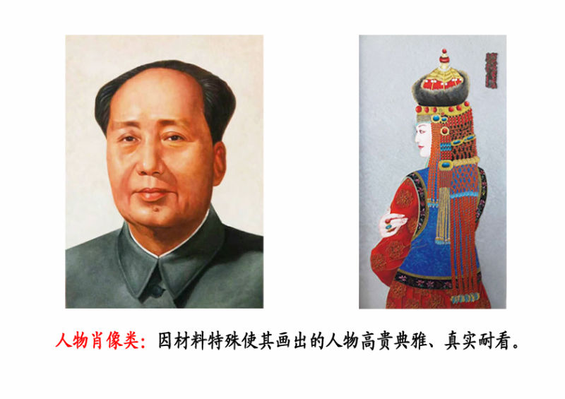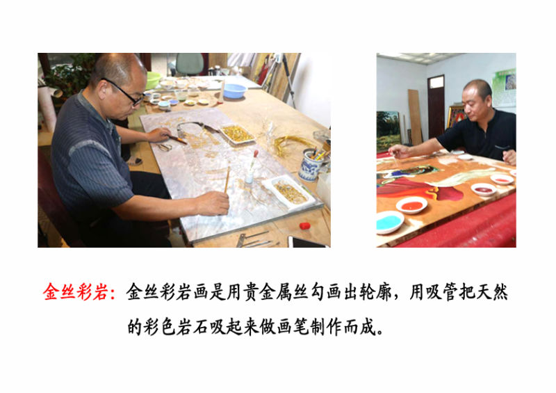金丝彩岩是以天然彩色岩石和贵金属丝为原料,用金属丝在画板上掐出线条,然后用天然彩色岩石作为原料,用吸管作为画笔,运用各种绘画技巧在画板上绘制出各种美丽的作品。金丝彩岩作品具有永不退色、立体感强、色彩艳丽等非常鲜明的艺术特色。