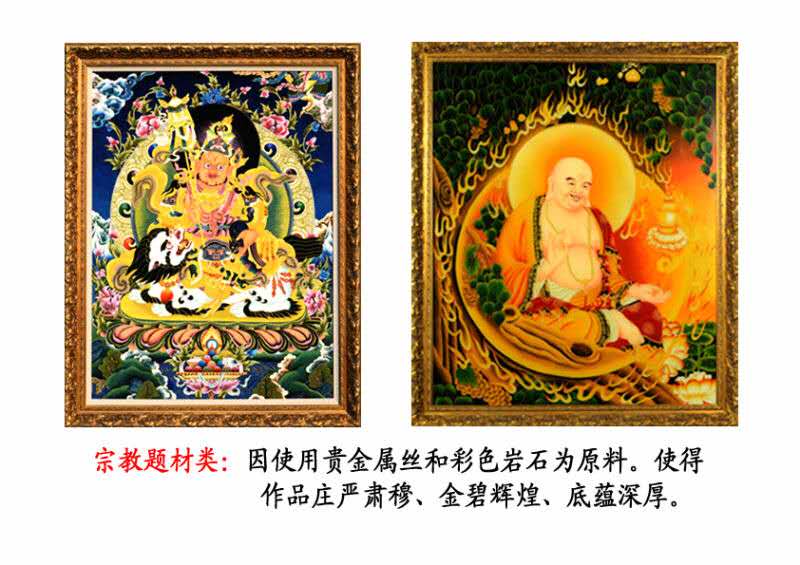 金丝彩岩工艺可以表现各种绘画种类,如国画、油画、水彩画、版画、壁画等,并能逼真的描绘出各种画种的质地质感,而且题材多样,不仅可以表现实物风景、人物、动物、静物等,还善于各种佛教题材的制作,表现唐卡艺术就是其中的一种。因此,金丝彩岩工艺品具有以下几种价值: