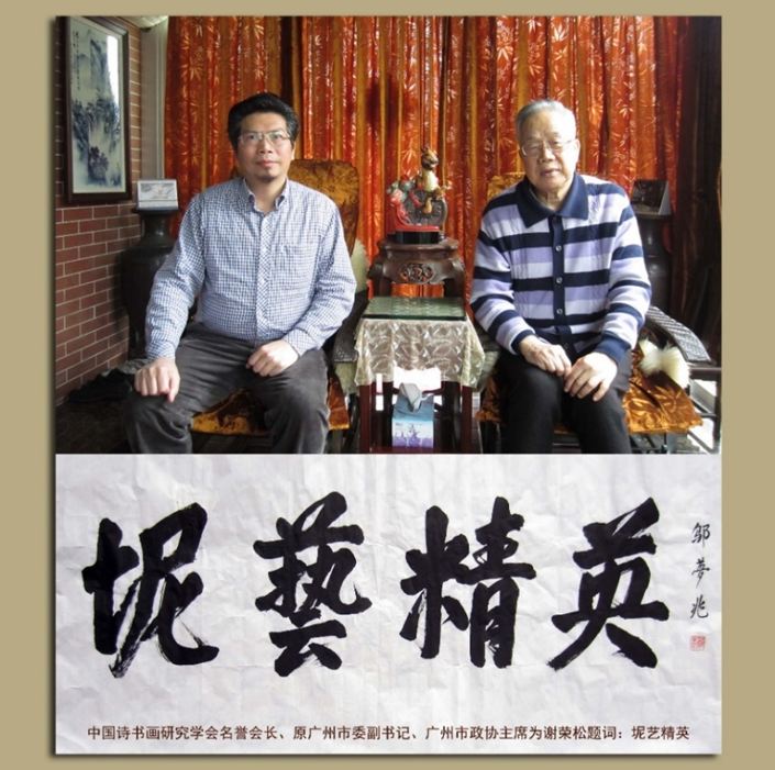 2011年秋,中国诗书画研究学会名誉会长、原中共广州市委副书记、原广州市政协主席邬梦兆先生在广州芳村“佑鑫书画陶艺工作室”参观了谢荣松的陶艺作品,赞不绝口,并为谢荣松题词:坭艺精英。