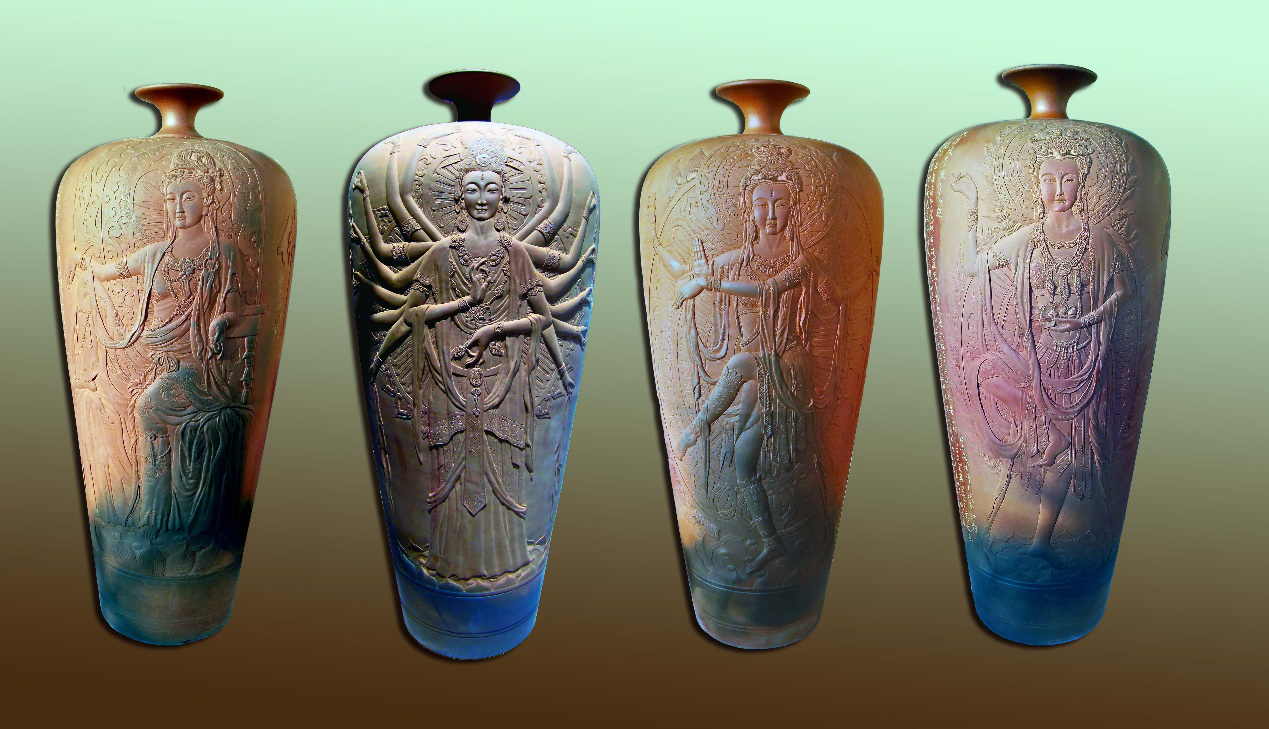瓶身创作:梅花瓶造型,烧制中成品为特色窑变。这4个梅瓶8个菩萨人物浮雕很精美,菩萨人物面貌完美端庄慈祥,手印、头饰、服装、文饰很庄严。
