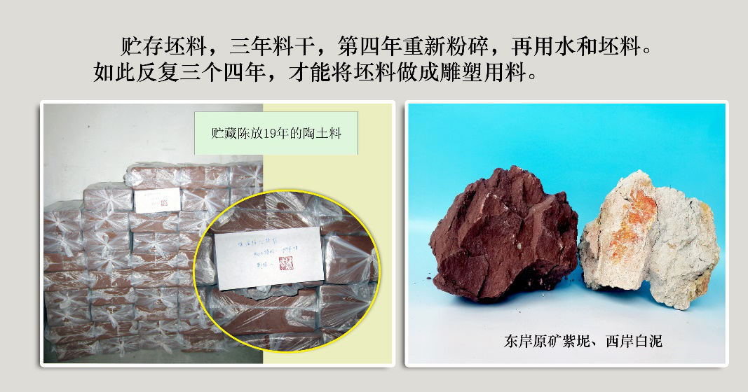 坭兴陶一般是按照东泥六西泥四的比例混合等工艺流程支撑陶坯料。这样炼制陶土坯坭料的方法,重点在于陈腐的环节,陈腐使细菌吃掉坯料中杂质和坭料。其作用突出有两个,其一,使坯坭的矿物质比例增大,原矿坭坯料更揉软,易制作陶艺。其二,12年以上的陈腐后的坭坯陶土,可以制作西方雕塑作品、板块浮雕、陶艺浮雕,制作椭圆、方形的陶艺,打破了传统陶艺只能为圆形器皿的局限,烧制过程中作品会变得更具青铜器的特质。第一件事,用了13年时间,见证了“十年磨一剑”的真理。