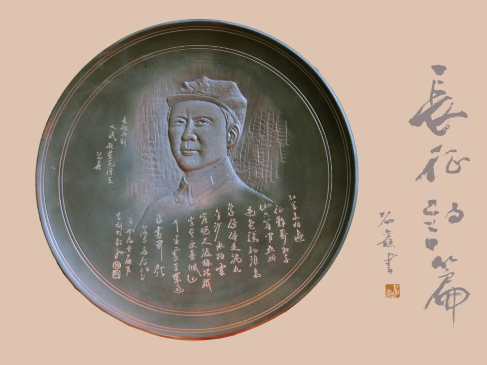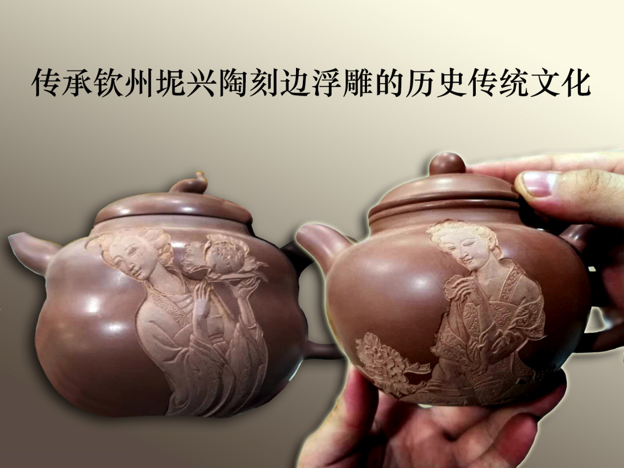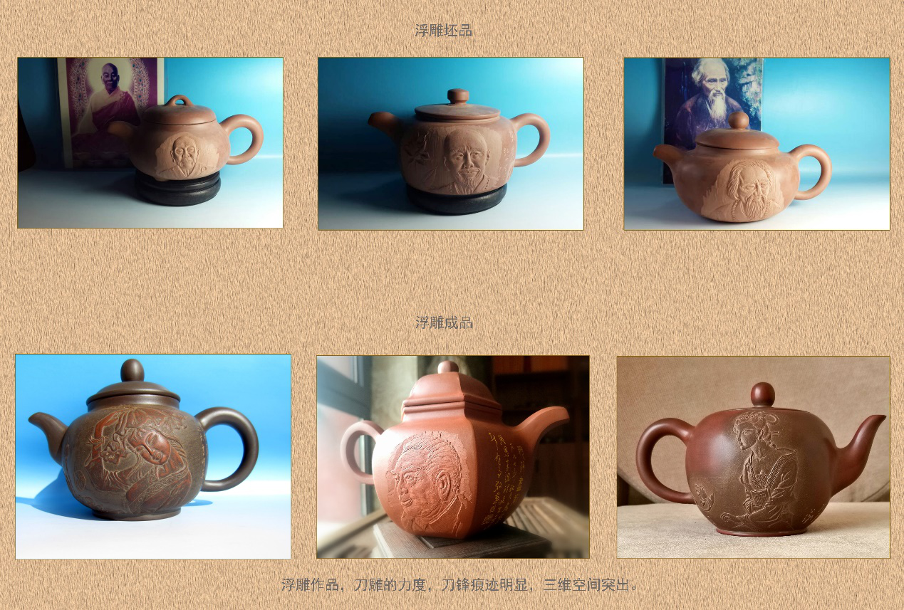 雕刻:传承传统的留边浮雕方法,用现代雕塑艺术的三维空间的透视技能,对人物进行三面立体浮雕。这是传承千年坭兴陶传统文化,弘扬中华文化的现代雕塑艺术的代表作。