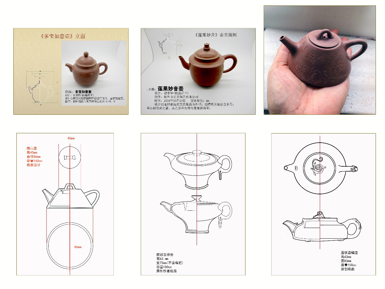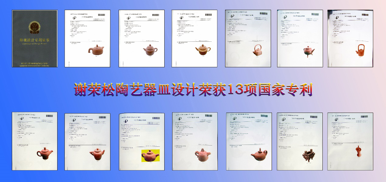 谢荣松(佑鑫)陶艺专利产品铲底三面立体浮雕作品共十三项。 其中,提梁壶2款,其他壶型9款,鼎皿1款、塔状罐1款