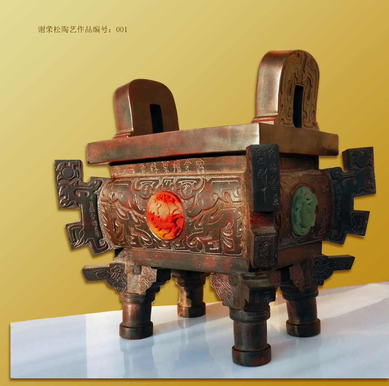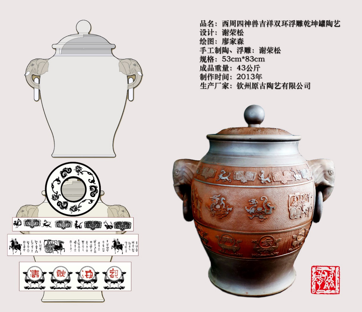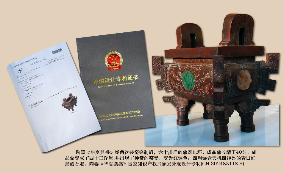 (2),设计、制作近50公斤重的浮雕陶器和鼎器皿。谢荣松颠覆了坭兴陶历史无方角多边多层的重鼎器皿和50公斤级的浮雕罐器皿。