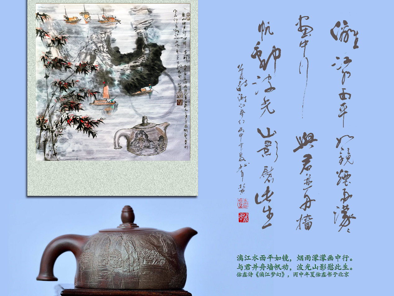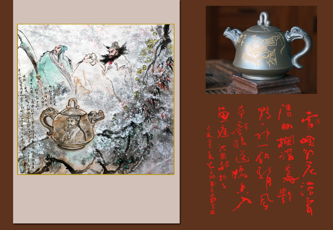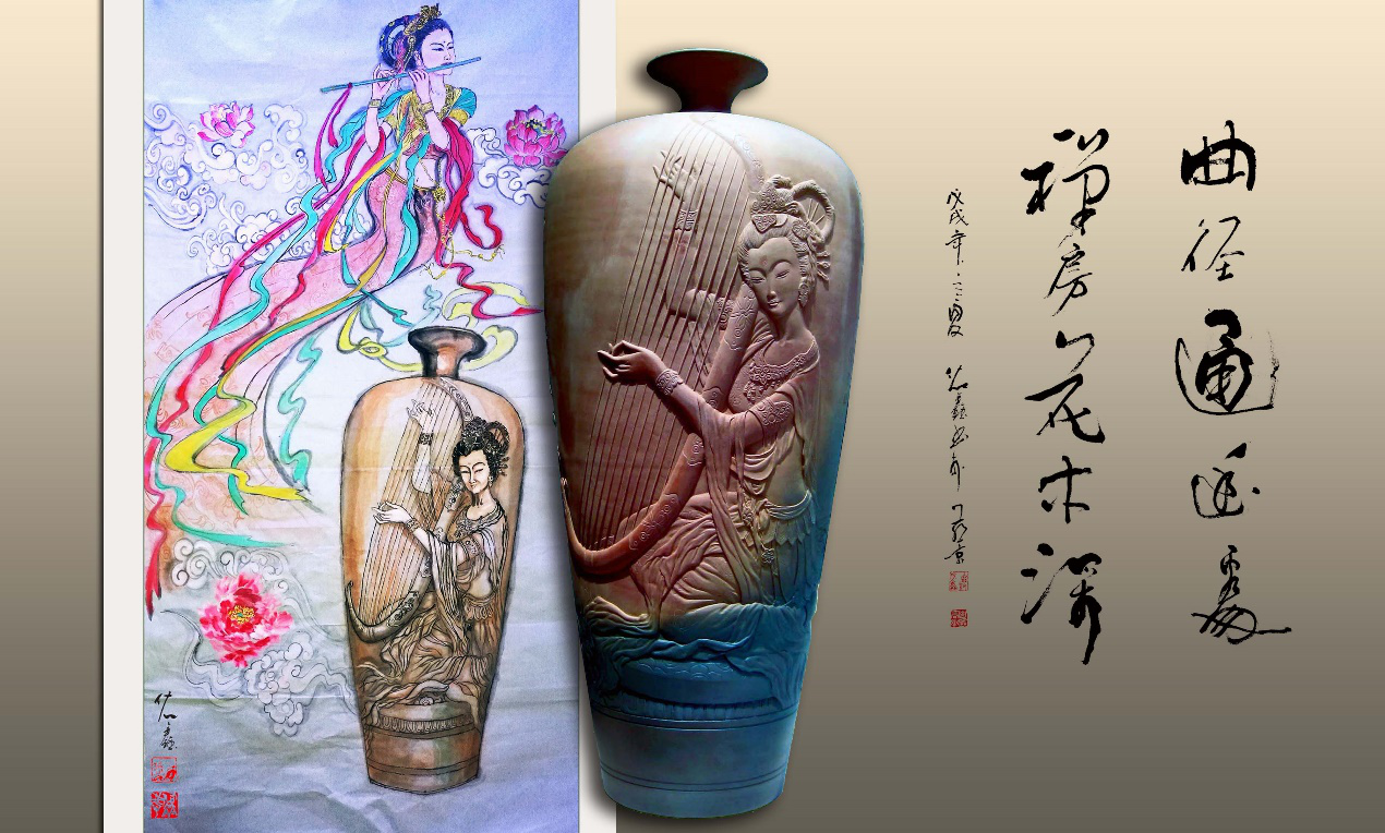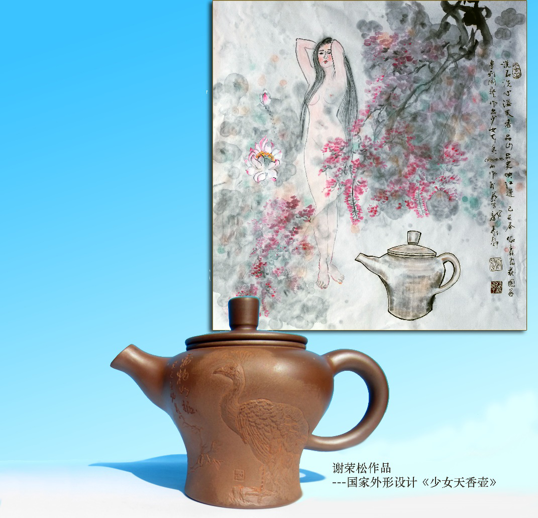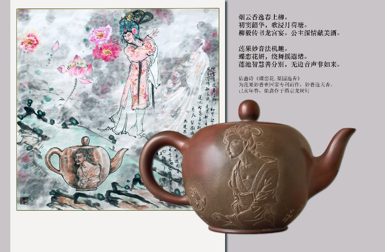 他在创作妙音逸天香壶时,先作一个梨园龙女题材的国画,再设计一个壶外形,再作诗词。