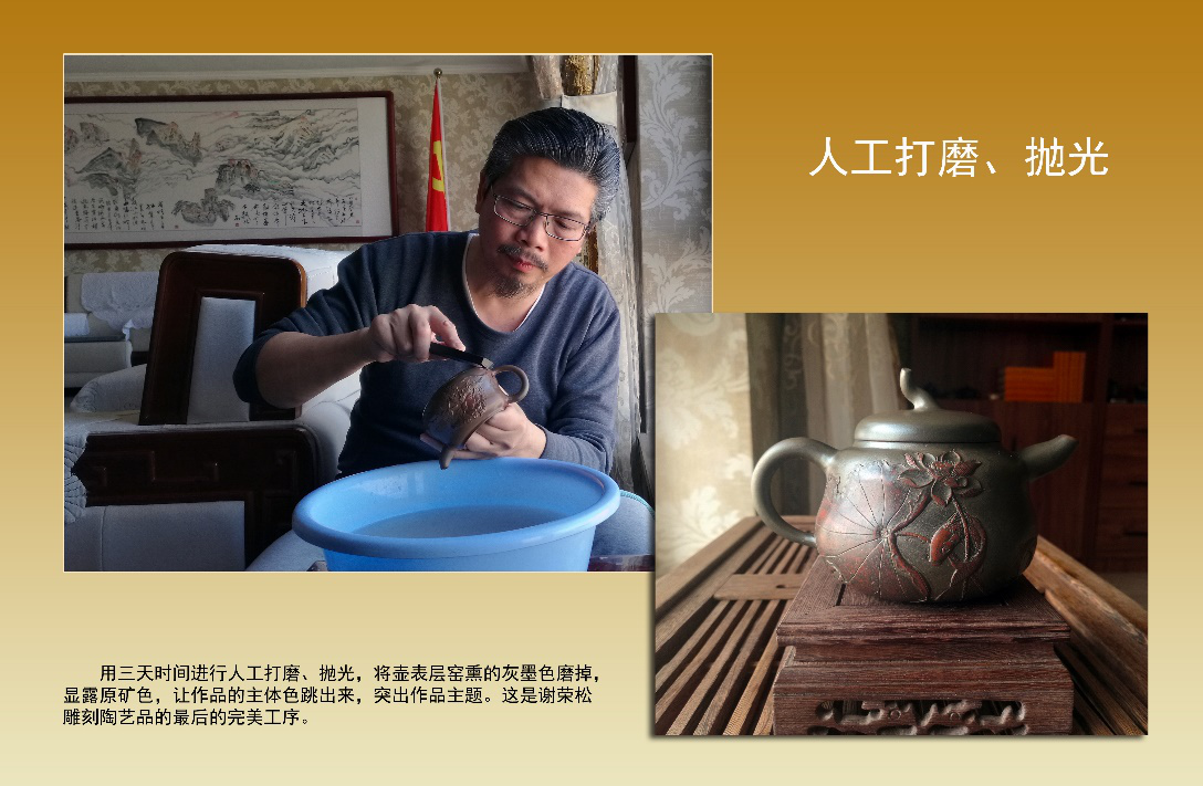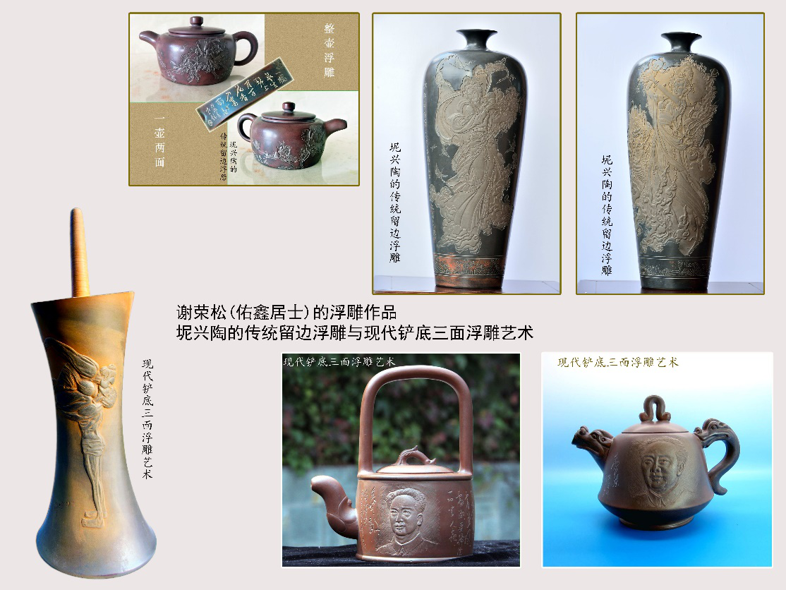 (3),谢荣松是一个诗书画的艺术家,他写诗词用书法、国画表现出来,进行器皿设计,制作坯品,雕刻诗情画意的人物浮雕,这是他独有的陶艺风格。