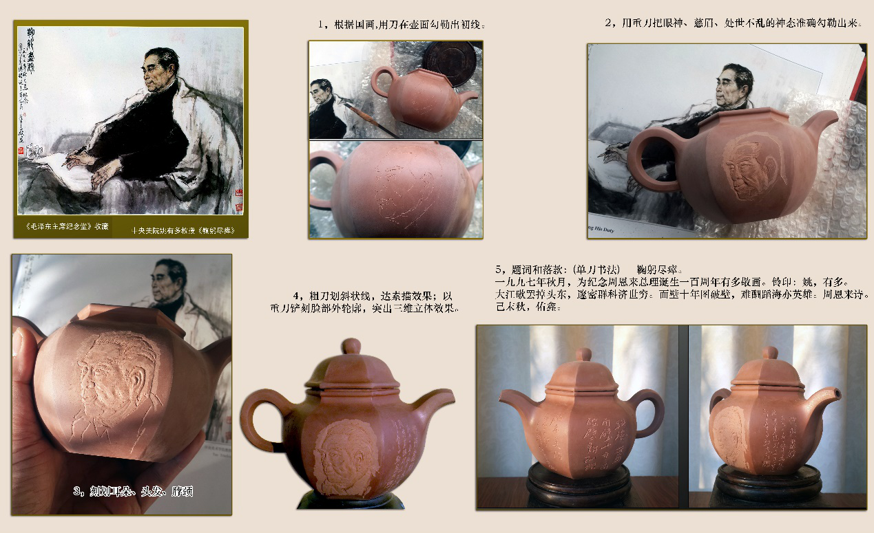 他创作过程是:创作诗词国画---书法---陶艺器皿外形设计---坯品定形---浮雕---单刀书法---烧制---打磨---再雕刻---再烧制---打磨---成品。他的作品,都是孤品。