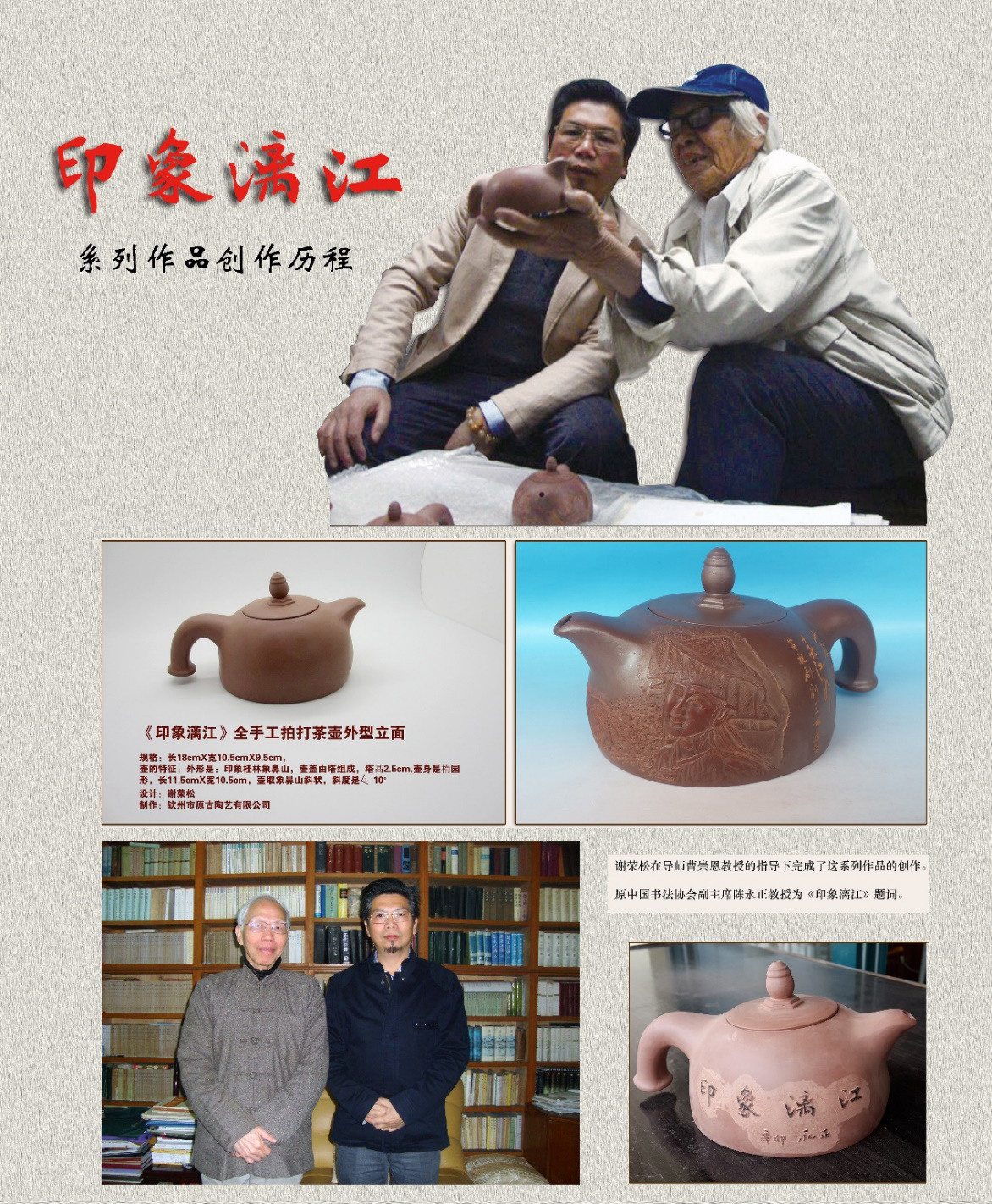 谢荣松陶艺编号:007印象漓江系列产品专利,由导师曹崇恩教授,原中国书法家协会副会长、中山大学陈永正教授,中国民族艺术研究院 研究员、中国高级工艺美术师谢荣松三人合作陶艺作品,作品特点是铲底三面立体浮雕、单刀书法的壶作品。