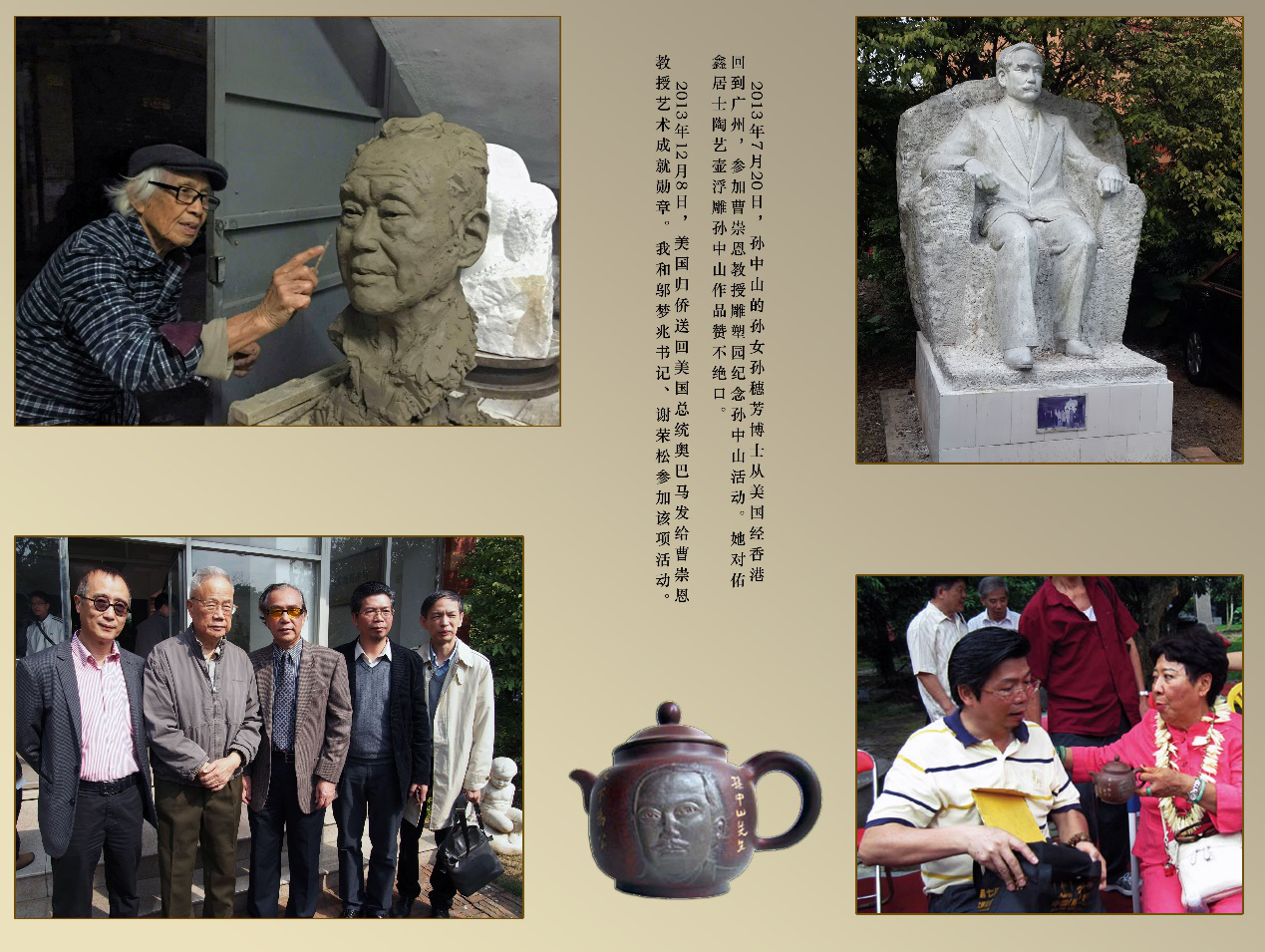 第二件事,以广州美术学院雕塑系的雕塑原理,按人物的身体比例,透视方法,以坭兴陶坯料,搭骨架,做模具坯,以雕塑的三维空间的立体造型塑造人像,实行烘干、高温烧窑、打磨修坯,再烧窑定型。