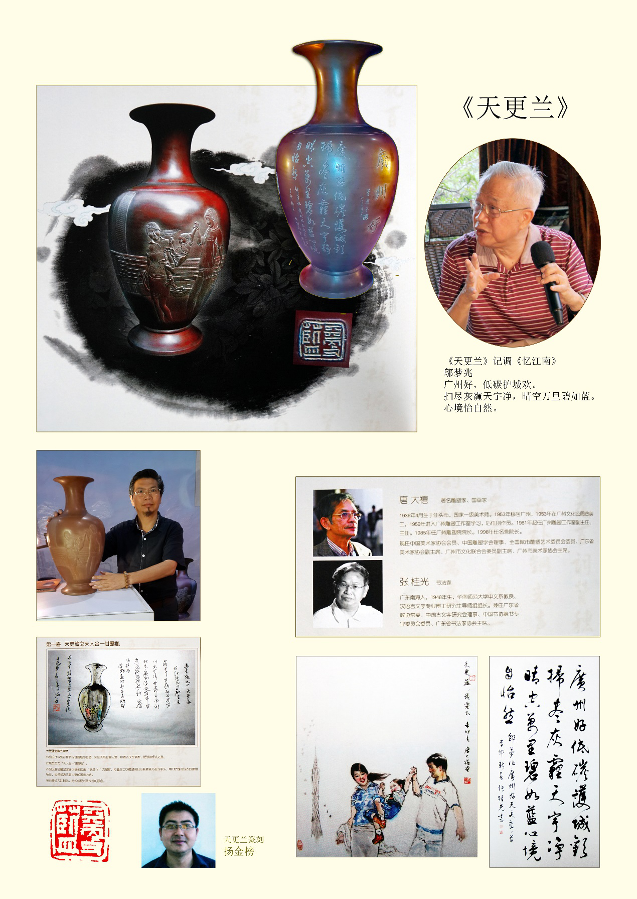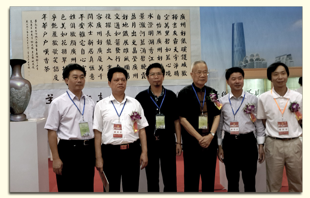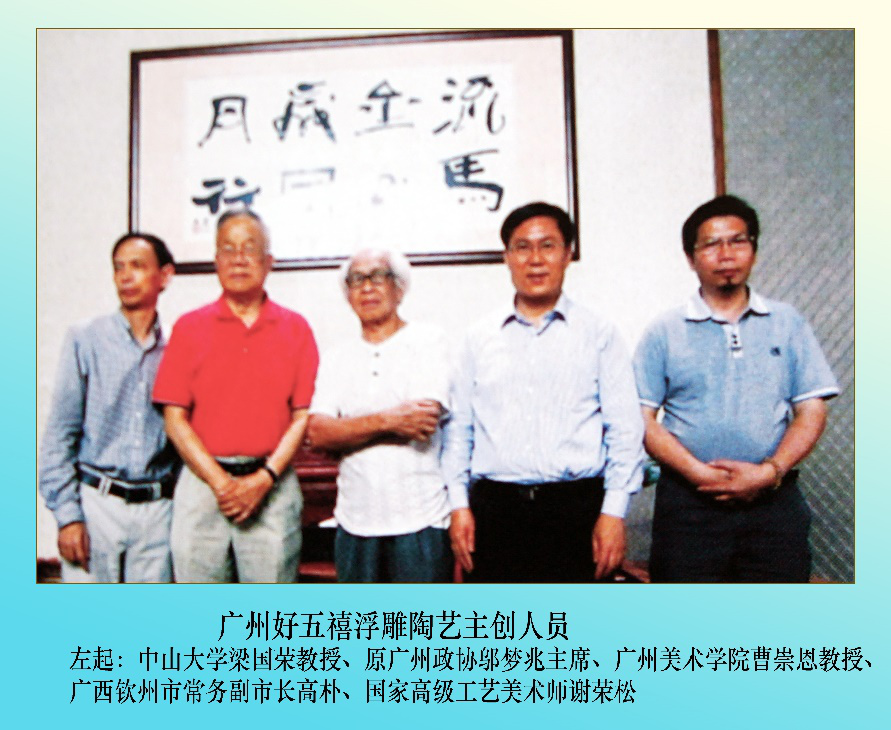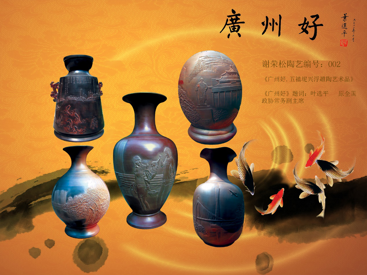 2009年6月,广东省委领导提出了“天更蓝、水更清、路更畅、房更靓、城更美”的广州城市建设蓝图,有力地推动广州城市环境建设,使城市面貌得到极大改善,在广州的城市建设历程上具有重要意义。2009年11月,谢荣松找到了我,道明了邬梦兆老书记最近写了《忆江南》五首广州好的诗词,要找两广(指广东广西两省自治区)的书法家、国画家、陶艺家、篆刻家、摄影家二十五人参加活动,他特邀我参与策划与组织该活动。我听后,觉得是一个极好机会,借此机会宣传和推广钦州坭兴陶,特别是宣传谢荣松的雕塑、陶艺作品,增強在广东的艺术界广泛知名度很有必要。