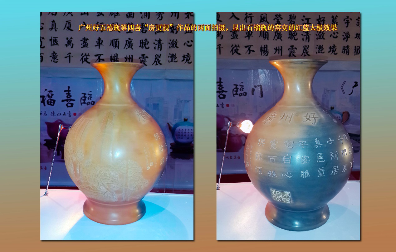 广州好五禧瓶第二喜:“水更清”作品设计,以广西南宁是“中国-东盟10+1”的永久国际博览会会议之地,第3届“中国-东盟10+1”的国际博览会开幕式,以“同饮一江水”为主题,中国和东盟10国领导人举起祥和盛水瓶倒入邕江,作为会议开幕之序,为此特设计“天水祥和瓶”。邕江是广州珠江的源头,意喻两广渊源远流长。