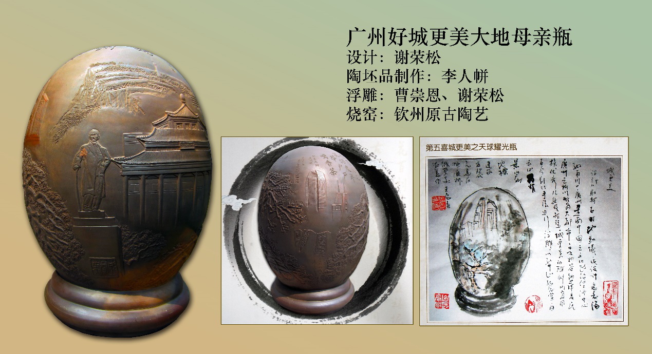 为了表达广州好城更美意愿,谢荣松在花瓶的设计考虑到浮雕的内容,国画以孙中山纪念堂的古建筑、越秀山古建筑与珠江新城的中轴线的现代建筑的对比,反映渊源历史千年商都发展成现代大都市的中国改革开放的前沿城市风貌。