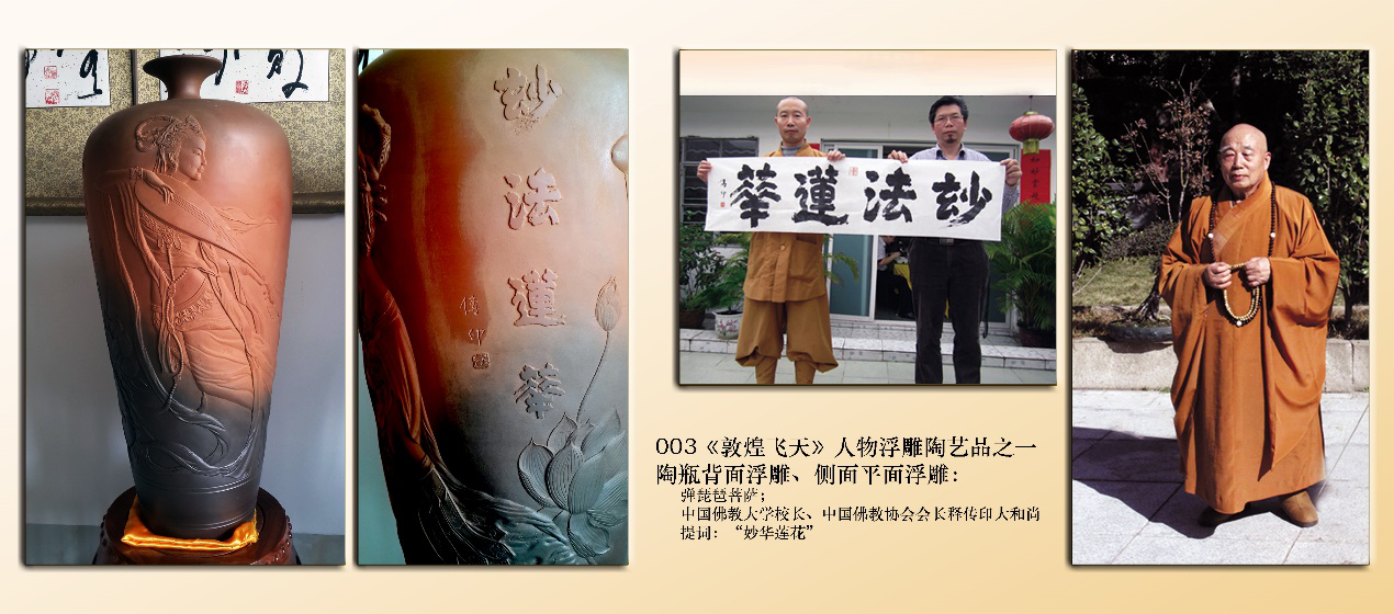 瓶身创作:浮雕2个飞天菩萨人物,单刀书法,刻有中国佛教协会会长释传印大和尚的题词“妙法莲花”书法及铃印