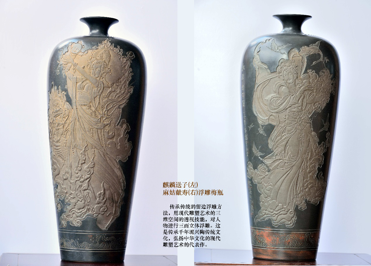 谢荣松陶艺编号:005《麒麟送子(左)麻姑献寿(右)浮雕一对梅瓶》