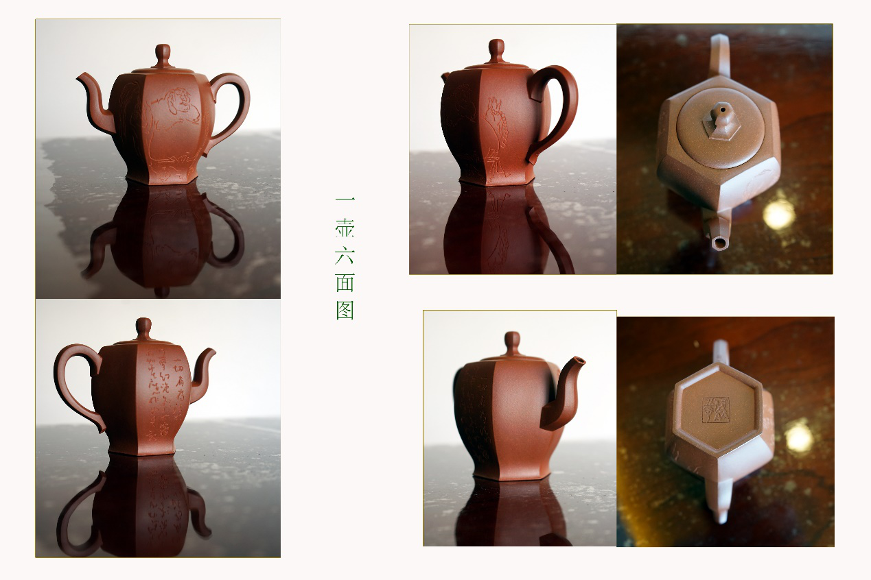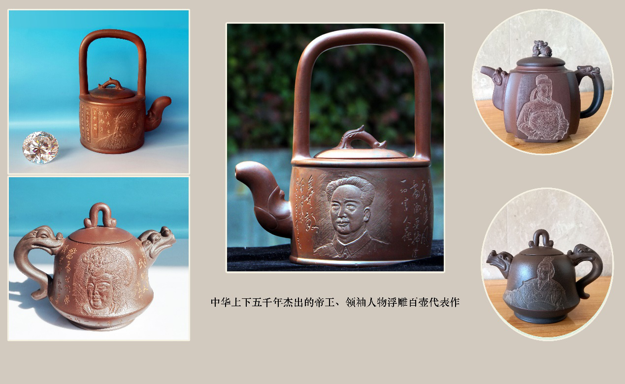 谢荣松陶艺编号:006专利产品铲底三面立体浮雕、单刀书法的提梁壶代表作
